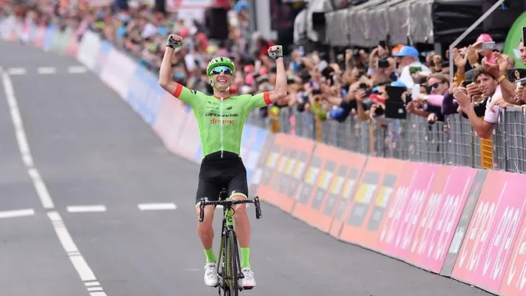 El francés, de 30 años, eligió la estrategia ganadora y nadie de sus inmediatos perseguidores pudo disputarle la victoria final; llegó a la meta de Canazei con una cómoda ventaja que le permitió celebrar su triunfo con las manos al cielo.