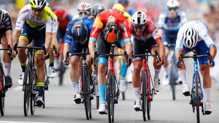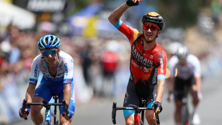 El sprinter del Bahrain batió a los australianos Caleb Ewan y Michael Matthews en una accidentada llegada. Alberto Bettiol mantiene el liderato.