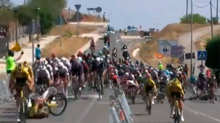 El neerlandés y sus compañeros Edoardo Affini y Chris Harper fueron los únicos que salvaron una caída a 500 metros de la línea de meta en Villadiego.