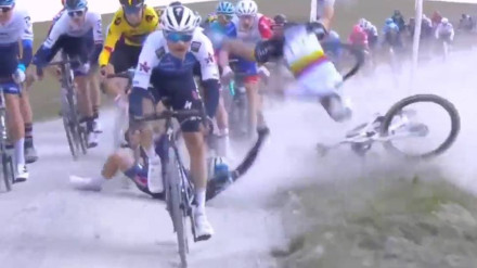 El campeón del mundo se fue al suelo en uno de los primeros tramos de sterrato tras estar implicado junto a una veintena de corredores en una durísima caída.