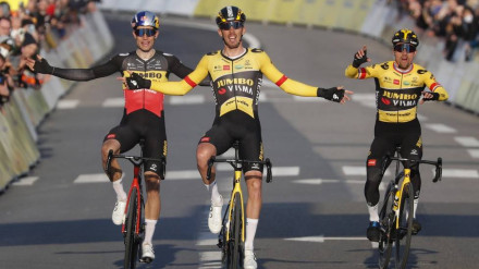 Laporte se llevó la gloria escoltado por sus compañeros Roglic y Van Aert. Los tres hombres del Jumbo saltaron en los kilómetros finales y sacaron en meta 19 segundos a Latour.