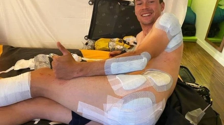 Roglic mostró en su cuenta de Instagram sus impresionantes vendajes, producto de las quemaduras que sufre en todo el lado izquierdo.