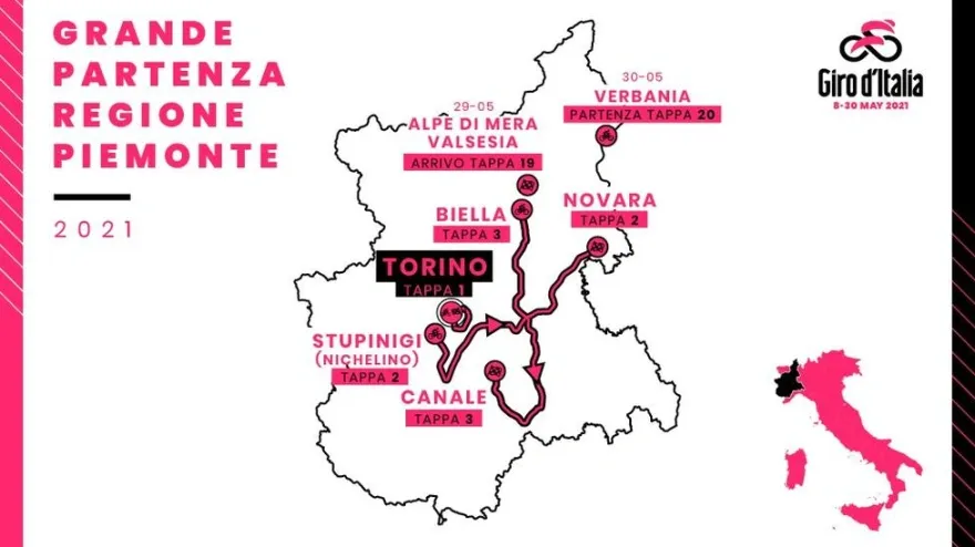 Las tres primeras etapas de la carrera se disputarán en la región del Piamonte. El Giro empezará el 8 de mayo con un prólogo de 9 kilómetros por las calles de Turín.