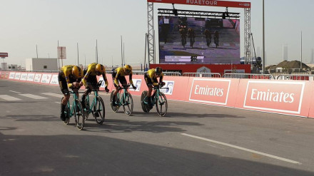 El conjunto holandés se impuso en la crono inicial al Sunweb y el Bahrein. Primoz Roglic se enfundó el primer maillot de líder de la general.