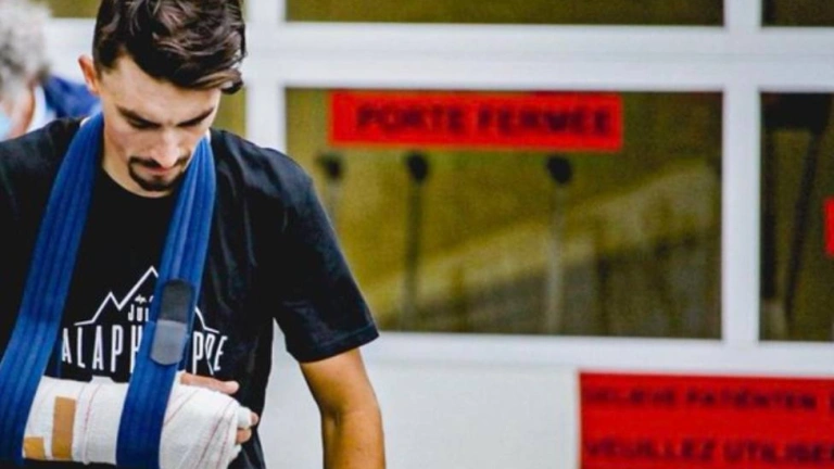 El francés, de 28 años, se fue al suelo al tocarse con una moto de carrera cuando faltaban 35 kilómetros para el final y formaba parte de un trío de escapados. Quedó tendido en la carretera con gestos de fuerte dolor. El campeón mundial fue llevado al hospital de Ronse, donde las radiografías mostraron fracturas en los metacarpianos 2 y 4 de la mano derecha, reveló el domingo el equipo.