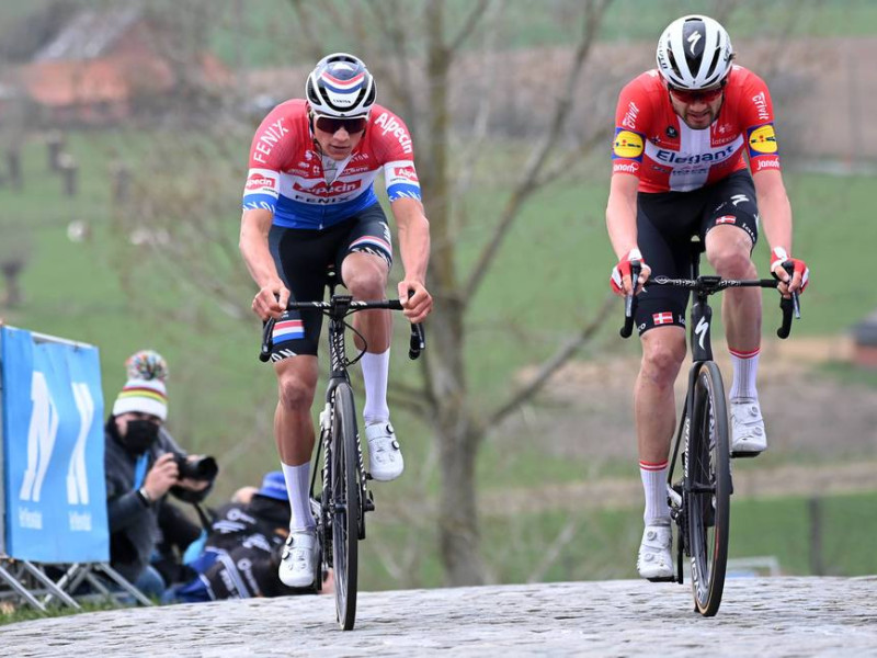 Duelo entre los dos más fuertes de Flandes en el Paterberg. Ambos se entendieron, se dieron relevos y "acordaron" jugarse la gloria entre ellos. Llegó la hora de decidir. Comenzó el marcaje. Van der Poel miraba, controlaba; Asgreen esperaba. Atacó primero Van der Poel, de lejos, a unos 250 metros de la pancarta. Abrió unos metros, pero Asgreen se puso a su altura, le reto en el esfuerzo por velocidad y terminó con la resistencia del vencedor de 2020, quien dejó de dar pedales ante el vendaval nórdico. Un triunfo elegante.