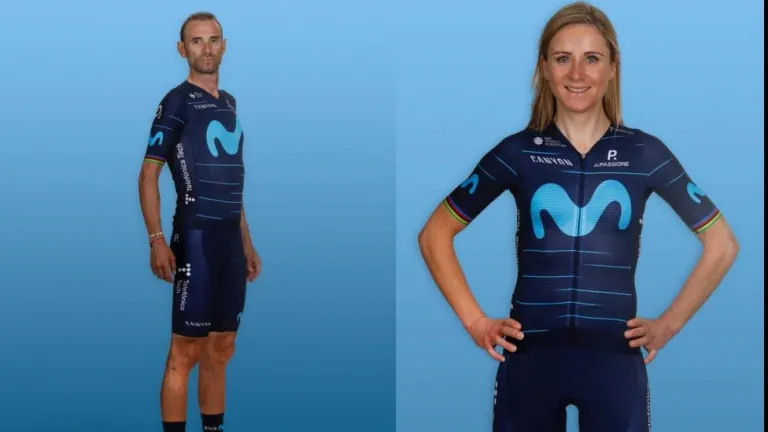 Los corredores españoles Alejandro Valverde y Enric Mas y la neerlandesa Annemiek van Vleuten han presentado la nueva equipación del Movistar Team para la próxima temporada de 2022, en la que sigue predominando el color azul y la característica 'M' de la empresa telefónica.
