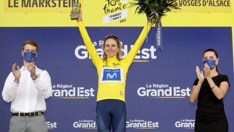En solitario, la deportista de Movistar culminó el Grand Ballon y en la meta le sacó cerca de tres minutos y medio a Vollering y Cecilie Ludwig (FDJ) y le arrebató el maillot de líder a su compatriota Marianne Vos (Jumbo), que se había hecho con el amarillo en la segunda etapa y lo había consolidado en la sexta, pero ahora está a más de 23 minutos.