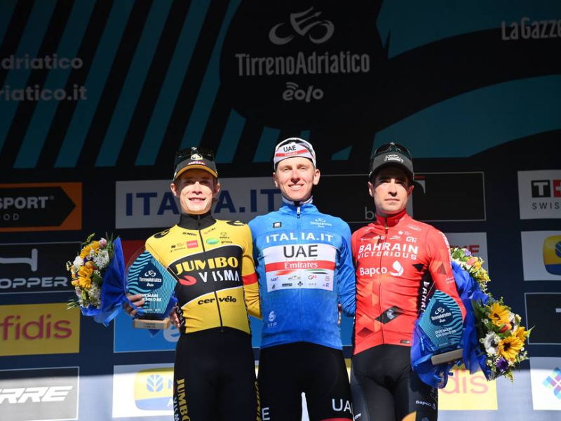 El esloveno volvió a conquistar la Tirreno Adriático y subió al podio final acompañado por el danés Vingegaard y Mikel Landa. La última etapa fue al sprint para el alemán Bauhaus.