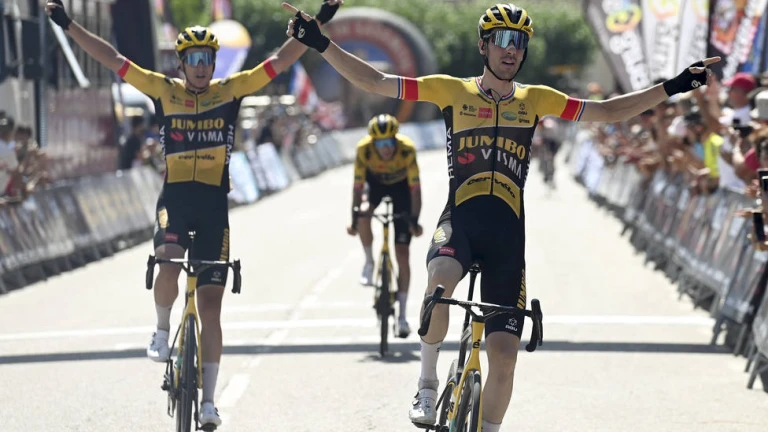 El neerlandés y sus compañeros Edoardo Affini y Chris Harper fueron los únicos que salvaron una caída a 500 metros de la línea de meta en Villadiego.