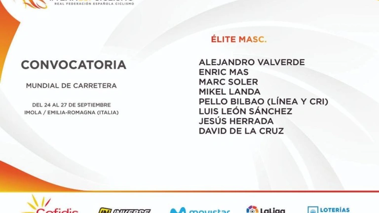 El seleccionador español de ciclismo, Pascual Momparler, anunció este domingo los citados para la competición, que se celebrará entre el próximo jueves 24 y el domingo 27, fecha en la que se disputará la prueba en línea sobre 259,2 kilómetro, con casi 5.000 metros de desnivel acumulado.