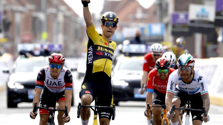 Con dos representantes en el grupo de cabeza, el Jumbo Visma tenía la responsabilidad de evitar que fueran cazados por los perseguidores en el modificado tramo final, más técnico que el previsto y más favorable a los ataques. Kung lo intentó a 2,4 km pero fue rápidamente atrapado por Van Hooydonck y Van Aert pudo, así, rematar el trabajo de su compañero para hacer valer su superioridad en el sprint.