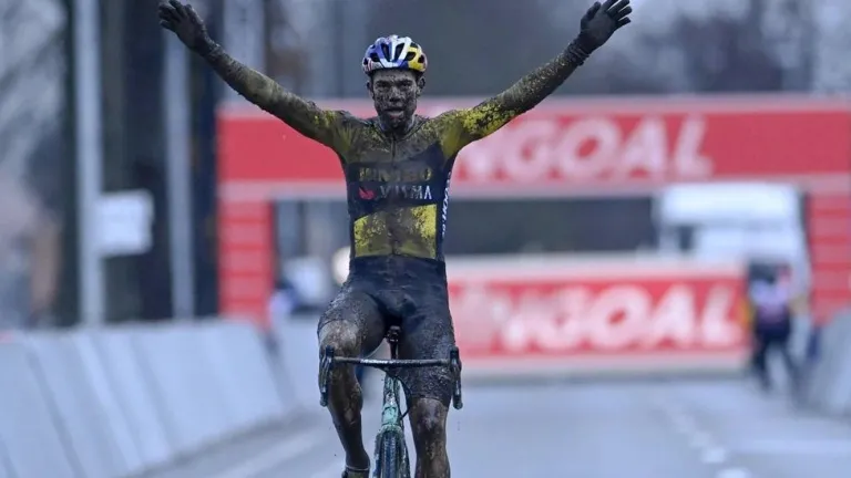 Van Aert impuso su dominio de principio a fin en una jornada marcada por las adversas condiciones meteorológicas. La tormenta Bella, que está azotando Europa con intensas lluvias y fuertes vientos, provocó que, vistas las complicaciones ocasionadas por el temporal en la categoría femenina, la organización decidiera modificar el recorrido para eliminar la peor sección.