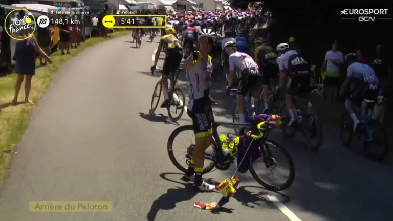 En un momento dado, la bandera de un aficionado, que se encontraba pegado a la calzada, se ha enredado en la bici del corredor, provocando una caída aparatosa. Al levantarse, el francés ha mostrado su descontento con el espectador levantando el pulgar y tirándole la bandera.