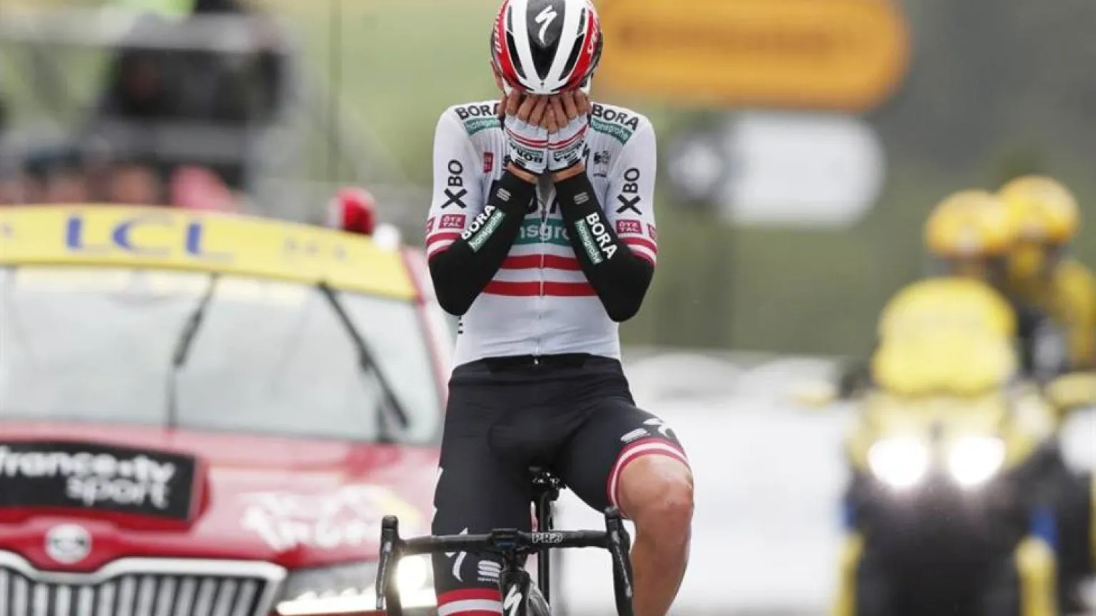 Pero el protagonista fue Patrick Konrad, quien aceleró en la subida al Portet D'Aspet para dejar a sus socios de aventura. Apostó por sufrir en solitario los 5,4 km de puerto el campeón de Austria. La maniobra coincidió con idéntica idea de Gaudu, a quien se soldó Colbrelli. Dos a la caza del ciclista del Bora, el primero en lanzarse en una bajada del Aspet muy peligrosa.