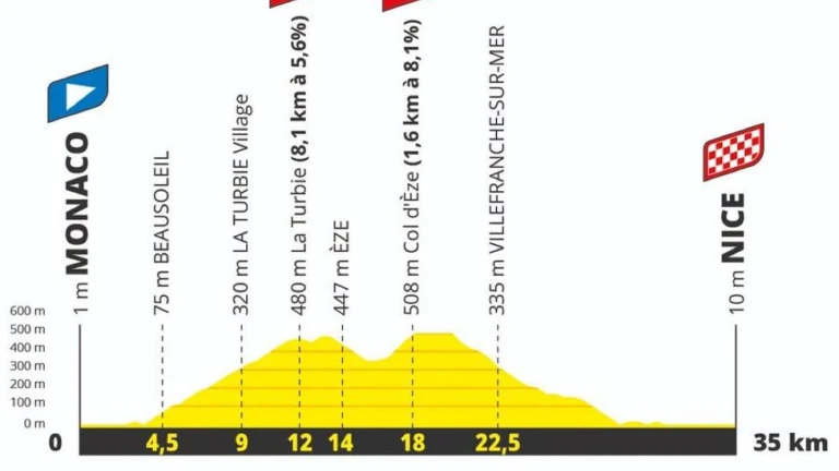 En esta ocasión, será una crono para escaladores, con 35 kilómetros que comenzarán en Mónaco y que incluyen un ascenso al puerto de la Turbie, 8,1 kilómetros al 5,6 % de desnivel medio, con su cima a los 12 kilómetros, antes de afrontar un ascenso a parte del Col d'Eze, apenas 1,6 kilómetros al 8,1 %.
