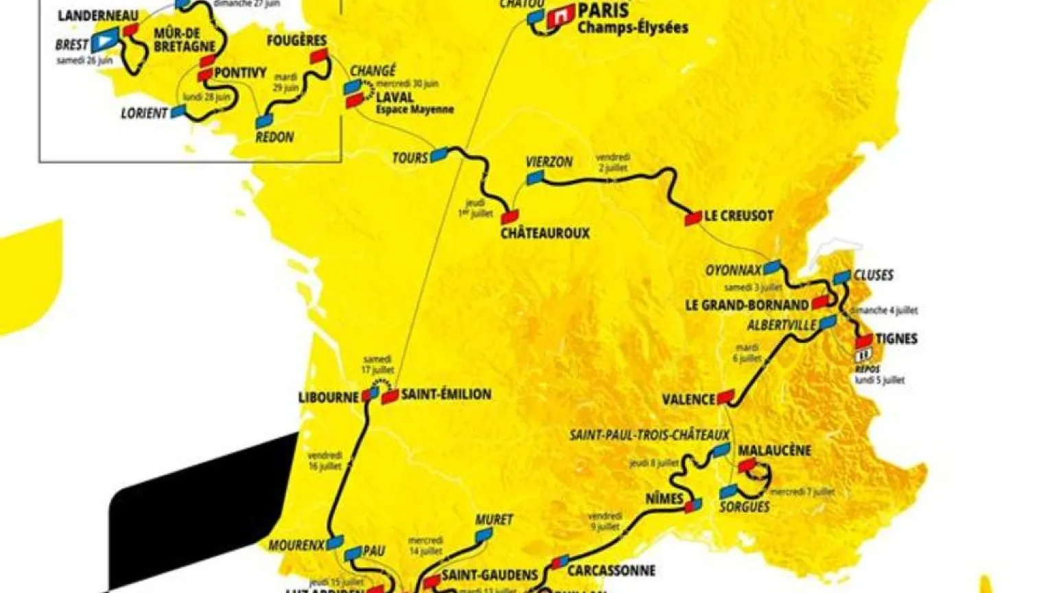 La edición comenzará el 26 de junio en Brest, ciudad que ha lanzado tres veces la carrera, un récord solo superado por París, con una etapa accidentada y donde el viento puede jugar un papel, lo que augura que un "aventurero" se haga con el primer amarillo.