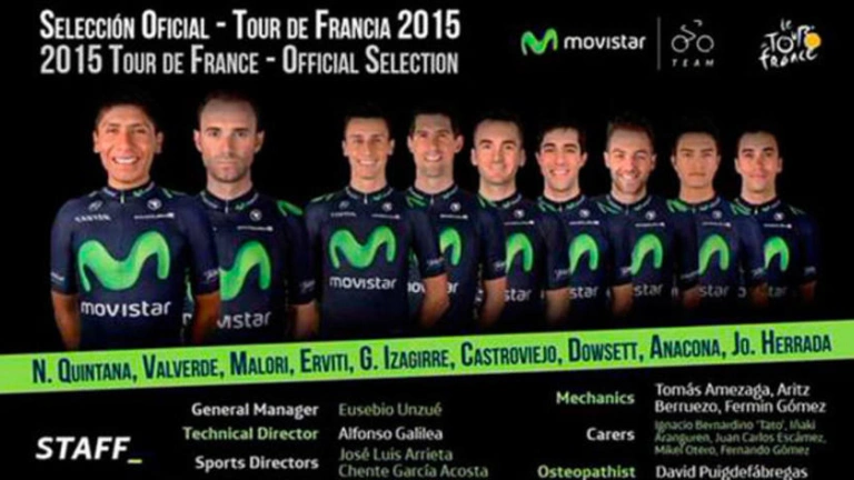 El colombiano Nairo Quintana, vencedor del Giro en 2014, y Alejandro Valverde, nuevo campeón de España de fondo, encabezan el equipo Movistar que el sábado próximo, en Utrecht (Holanda), tomará la salida en el Tour de Francia. La formación de Eusebio Unzúe ha confirmado el "nueve" que alineará en la ronda francesa: "Ws el equipo más equilibrado y el que nos podía aportar, para todos los terrenos, lo que necesitábamos", comenta en un comunicado del equipo. Junto a Quintana y Valverde, formarán en la escuadra telefónica los españoles Imanol Erviti, Jonathan Castroviejo -campeón de España contrarreloj-, Gorka Izagirre y José Herrada, el italiano Adriano Malori, el británico Alex Dowsett y el colombiano Winner Anacona. En la dirección deportiva estarán José Luis Arrieta y Chente García Acosta. "Ya dije en el Giro que elegir un nueve para Italia había sido muy difícil, pero ver los hombres que hemos dejado en casa demuestra que en este Tour, configurar un 'nueve' lo ha sido aún más", aseguró Unzúe. El mánager del equipo apunta "tres vertientes de corredores: un grupo más escalador, con Winner y José en primer lugar; todoterrenos como Gorka o Jonathan, útiles en todo momento; y rodadores de la talla de Alex, Adriano o Imanol, que nos darán tranquilidad en las jornadas más llanas". "El liderazgo es claro: Nairo es nuestra referencia principal en la carrera. En cualquier caso y conociendo las circunstancias que pueden darse en un Tour, no vamos a renunciar a que Alejandro, mientras los hechos no demuestren lo contrario, pueda estar a su lado y a la vez mantener vivas sus posibilidades, que también son las nuestras", precisó Unzúe