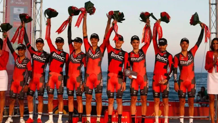 El equipo BMC, campeón mundial de la especialidad, se ha proclamado vencedor de la contrarreloj inaugural de la Vuelta a España disputada entre Puerto Banús y Marbella con un recorrido de 7,4 kilómetros, en la que el primer maillot rojo "simbólico" se lo enfundó el eslovaco Peter Velits.También ganador de las cronos colectivas del Tour y Dauphiné, la escuadra estadounidense arriesgó en la superficie de tierra más que los rivales y logro marcar un tiempo imbatible de 8.10 minutos, a una media de 54,3 kms/hora. Aventajó en 1 segundo al Tinkoff Saxo y al Orica GreenEdge.En esta prueba solo se contabilizaron los tiempos para la clasificación por equipos, y no para la general individual al considerar la UCI que el trazado por superficie de albero representaba un peligro para la seguridad de los ciclistas.El eslovaco Peter Velits, el primer corredor en atravesar la línea de meta en la escuadra del BMC, es el simbólico primer maillot rojo de la Vuelta y lo defenderá en la segunda etapa que se disputa este domingo entre Alhaurín de la Torre y Caminito del Rey.Las formaciones de los favoritos no arriesgaron más de la cuenta en la temida superficie de albero y cedieron un tiempo que no afecta a la lucha individual de la general.El Movistar de Quintana y Valverde cedió 24 segundos, el Astana de Nibali, Aru y Landa medio minuto y el Sky de Chris Froome a.21 minutos.