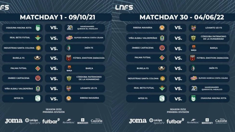 El Barça, vigente campeón, iniciara la liga de la Primera división de Fútbol Sala 2012-22 con una exigente visita a la cancha del Palma Futsal, mientras que el Levante, que quedó subcampeón, lo hará en casa del Viña Albali Valdepeñas, en una Fase Regular que empezará el próximo 9 de octubre para concluir el 4 de junio de 2022.