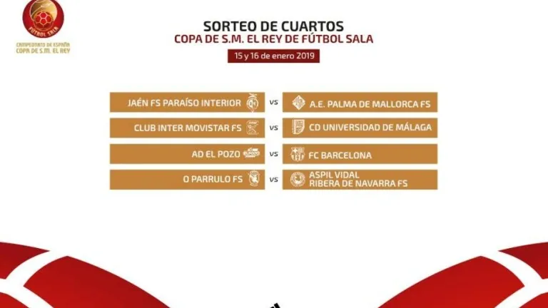 En los tres enfrentamientos restantes de cuartos de final, el Movistar Inter recibirá la visita del BeSoccer CD UMA Antequera, el Jaén Paraíso Interior ejercerá de anfitrión ante el Palma Futsal y el O Parrulo Ferrol hará lo propio frente al Aspil Vidal Riber Navarra.