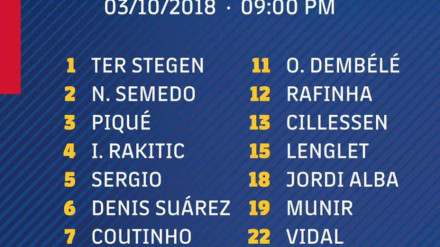 Además siguen fuera de la convocatoria por decisión técnica Carles Aleñá y Sergi Samper, además de los lesionados Umtiti y Sergi Roberto.
