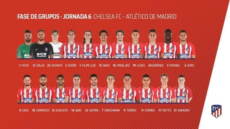 La convocatoria está compuesta por los 21 futbolistas disponibles del primer equipo: los porteros Jan Oblak, Miguel Ángel Moyá y Axel Werner; los defensas Sime Vrsaljko, José María Giménez, Stefan Savic, Lucas Hernández, Diego Godín y Filipe Luis; los medios Koke Resurrección, Thomas Partey, Gabi Fernández, Saúl Ñíguez, Yannick Carrasco, Augusto Fernández y Nico Gaitán; y los delanteros Kevin Gameiro, Fernando Torres, Ángel Correa, Antoine Griezmann y Luciano Vietto.