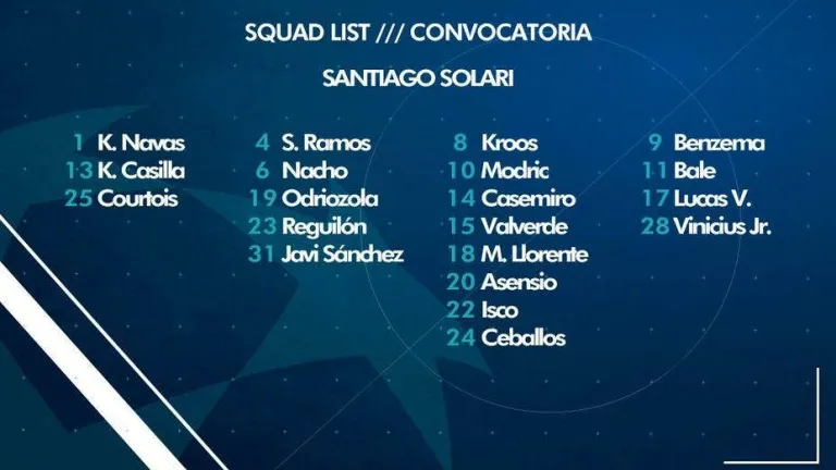 La lista de convocados la integran: Courtois, Keylor Navas, Kiko Casilla, Odriozola, Sergio Ramos, Javi Sánchez, Nacho, Reguilón, Casemiro, Marcos Llorente, Kroos, Modric, Fede Valverde, Ceballos, Isco, Marco Asensio, Lucas Vázquez, Vinicius, Bale y Benzema.