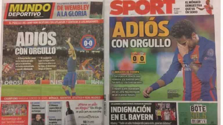 "Adiós con orgullo", resalta en su portada el diario Sport, acompañando una foto del brasileño Neymar, cabizbajo tras la eliminación de su equipo. "El Barça puso el corazón para remontar a la Juventus pero fue ineficaz y no tuvo opciones", señala en un breve resumen del transcurso del encuentro y no se olvida de la ovación que el equipo recibió "por un Camp Nou entregado desde el primer minuto". "Sangre, sudor y lágrimas", titula el periódico en la crónica del partido de un Barcelona que "se despidió de la Champions en una noche de sentimientos encontrados". Para el cronista, "dos milagros al mes eran demasiado incluso para este Barça", que ya tuvo que remontar en la anterior eliminatoria ante el Paris Saint-Germain.