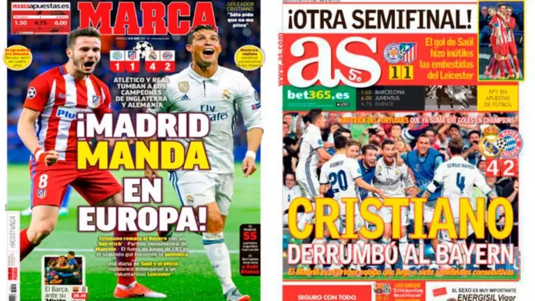 "¡Madrid manda en Europa!", titula en portada a doble página el diario Marca, que señala que tanto Atlético como Real Madrid "tumban a los campeones de Inglaterra y Alemania" y vuelven a clasificarse para la semifinal, "tercera en cuatro años" para los rojiblancos y "séptima consecutiva de los blancos". El periódico madrileño destaca el "partido monumental de Marcelo" y los tres goles de un Cristiano que "remata al Bayern", a pesar de que el segundo gol "enciende la polémica" arbitral. Tampoco se olvida del gol marcado por Saúl ni del "oficio rojiblanco" para conseguir doblegar a un "voluntarioso Leicester" que puso fin a su andadura europea.