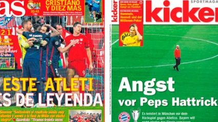 El Atlético de Madrid de Diego Simeone vuelve a ser protagonista de la prensa deportiva española tras una noche histórica en la Liga de Campeones, en la que logró el pase a la final de Milán. "Este Atleti es de leyenda", titula el diario AS en su portada, recordando que "El gol de Griezmann entierra un trauma que duró 41 años". Así mismo, recalca en su crónica que "Oblak, decisivo: paró un penalti y casi todo lo que le lanzó el Bayern". "Si fuera fácil el Atleti no lo haría", subraya. Entre tanto, Mundo Deportivo abre su portada con el titular: "¡A Milán!, al que acompaña una fotografía del momento de la celebración por la consecución del pase a la final. "El Atleti borra el KO de 1974, deja al Bayern en la cuneta y alcanza su 2ª final en tres años" y "Griezmann y Oblak deciden un duelo épico con dos penaltis fallados por Müller y Torres", destaca en su primer página. Por su parte, el diario Marca abre su edición con un: "¡Sois increíbles!", aunque deja un espacio significativo para el partido que disputarán esta noche Real Madrid y Manchester City. Una instantánea de la celebración del gol de Griezmann, arropado por Gabi y Torres es la imagen elegida para su portada. "Gracias, Atlético", es el titular de su crónica en la que resaltan también que "El gol de Griezmann a la contra decide ante un Bayern grandioso". Marca recuerda también que "tres equipos españoles han eliminado a Guardiola en las tres últimas semifinales". Mientras, Sport elige "El Fútbol es así", un titular al que acompaña una fotografía de un Guardiola cabizbajo y otro de un Simeone pletórico. "El Atlético deja a Pep sin final en un partido épico" y recuerda que "El Madrid se la juego hoy ante el City".La prensa alemana elogia de forma prácticamente unánime el juego del Bayern de Múnich frente al Atlético de Madrid anoche en la Liga de Campeones, una "amarga" victoria insuficiente para pasar a la final y que deja a Pep Guardiola sin opciones de triplete en su despedida de Alemania. "La victoria más amarga de Pep", titula el popular 'Bild', que describe el partido como una "enorme batalla". Al catalán, recuerda, se le escapa una vez más la posibilidad de ganar la Liga de Campeones junto a la Bundesliga. En su última temporada en Múnich, el Bayern de Guardiola vuelve a perder la Champions frente a un equipo español, tras la eliminación en 2014 frente al Real Madrid y el año pasado frente al Barcelona. Esas derrotas son las que recuerda el deportivo "Kicker" en su portada bajo el titular "El amargo hat-trick". Tras una "gran noche de fútbol" y un juego "dramático" que hizo a muchos perder los nervios, destaca la revista, el Bayern quedó por tercer año consecutivo aparcado en semifinales de la Liga de Campeones, que logró ganar en 2013, y esta vez ante un equipo al que dominó la mayor parte del tiempo. El diario bávaro "Süddeutsche Zeitung" se centra también en la figura de Guardiola, que "se ha sentado solo en el banquillo de acusados", advierte. "Pep Guardiola, considerado por muchos como el mejor entrenador del mundo, no lo consiguió. Durante tres años quiso ganar la Liga de Campeones con el Bayern de Múnich. Tres veces quedó eliminado en las semifinales", escribe el rotativo, recordando que el catalán no fue contratado solo para hacerse con la Bundesliga y la Copa de Alemania. "He dado mi vida por estos jugadores", es la frase del entrenador elegida por el "Frankfurter Allgemeine" para resumir el estado de Guardiola tras la eliminación de ayer. El Bayern pasó por encima de los "rojiblancos" como un "huracán" en el primer tiempo, pero los españoles fueron quienes sonrieron al final mientras que los muniqueses "apenas podían creer que, con su mejor actuación desde hace meses, se iban de vacío", resume este diario.