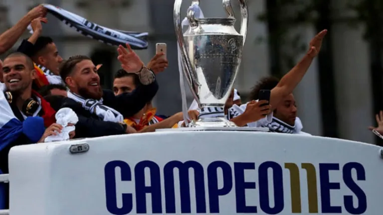 El capitán Sergio Ramos, y el resto de la plantilla del Real Madrid, ofrecieron este domingo la Copa de Europa conquistada en Milán frente al Atlético a la diosa Cibeles y a los miles de aficionados blancos que acudieron a celebrar el undécimo título continental de la historia del club. El avión procedente de Milán aterrizó en el aeropuerto Madrid Barajas-Adolfo Suárez pasadas las seis de la mañana y a las 6:40 la plantilla puso rumbo al estadio Santiago Bernabéu para hacer una parada y cambiar de autobús. A las 7.15, los jugadores madridistas se subieron a un autobús descapotable para iniciar su recorrido por las calles de Madrid que terminaría en la fuente de Cibeles. El primero en subir al autobús en el Santiago Bernabéu para alzar la Copa de Europa fue el defensa salmantino Álvaro Arbeloa, que se despide del club tras siete temporadas con este título. A las 7.30, el autobús madridista llegó a Cibeles para delirio de los miles de aficionados que aguantaron en muchos casos más de siete horas para ver a sus ídolos en directo. La espera al equipo estuvo amenizada desde las doce y media de la madrugada por un espectáculo de música, dirigido por el pinchadiscos y presentador radiofónico Carlos Moreno 'El Pulpo', que combinó música electrónica, rock de grupos como AC/DC o Queen. Custodiando a la copa en el frontal del autobús estuvieron en todo momento el capitán Sergio Ramos y el portero costarricense Keylor Navas, que inmortalizó con una cámara la vuelta de honor que dieron a la Cibeles ante los aplausos de la afición. La fuente estuvo rodeada por un panel blanco con la inscripción 'CAMPEO11ES', haciendo un juego de palabras con las letras en mayúsculas y la cifra de trofeos europeos del conjunto blanco. Al grito de 'Como no te voy a querer', y con el himno de fondo, la plantilla descendió del autobús y fueron Cristiano Ronaldo y Sergio Ramos los encargados de portar la Copa de Europa alrededor de la diosa Cibeles. Posteriormente fue el defensa sevillano, en su condición de capitán, el encargado de atar una bandera del Real Madrid a la Cibeles y ofrecer la Copa de Europa con el 'We are the Champions' de Queen de fondo. Diecisiete minutos después de llegar a la Cibeles, la plantilla madridista volvió a subirse al autobús para poner fin a la celebración y regresar al Santiago Bernabéu.