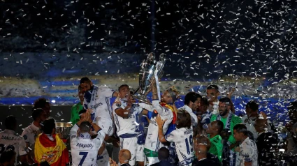 La fiesta de la plantilla del Real Madrid que esta temporada ha conquistado el doblete, además de la Supercopa Europea y la Mundial de Clubes, culminó en el estadio Santiago Bernabeu, con la presencia de cada jugador en medio del habitual espectáculo de luz y sonido, que animó la fiesta.