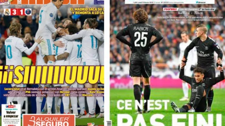 El Madrid-PSG de este miércoles acapara las portadas deportivas tanto en España como en Francia. Los diarios ensalzan la pegada del Madrid y su gran partido si se cuestionan si es posible la remontada parisina en la vuelta.