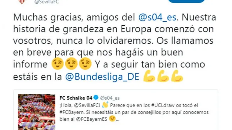 "Muchas gracias, amigos del Schalke 04. Nuestra historia de grandeza en Europa comenzó con vosotros, nunca lo olvidaremos. Os llamamos en breve para que nos hagáis un buen informe. Y a seguir tan bien como estáis en la Bundesliga", contestó el Sevilla.