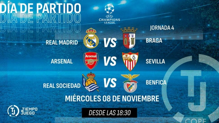 El Real Madrid recibirá este miércoles al Sporting de Braga con la intención de firmar el pase a octavos de final de la Liga de Campeones a las primeras de cambio. El otro equipo español en una situación similar es la Real Sociedad. Los donostiarras luchan por certificar su clasificación a octavos frente a un Benfica que tiene las cosas muy difíciles para clasificarse para la siguiente ronda. Sin embargo, el Sevilla se medirá al Arsenal en una situación muy diferente. El equipo hispalense necesita una victoria para poderse agarrar a la posiblidad de jugar los octavos de final de la Champions Leeague.