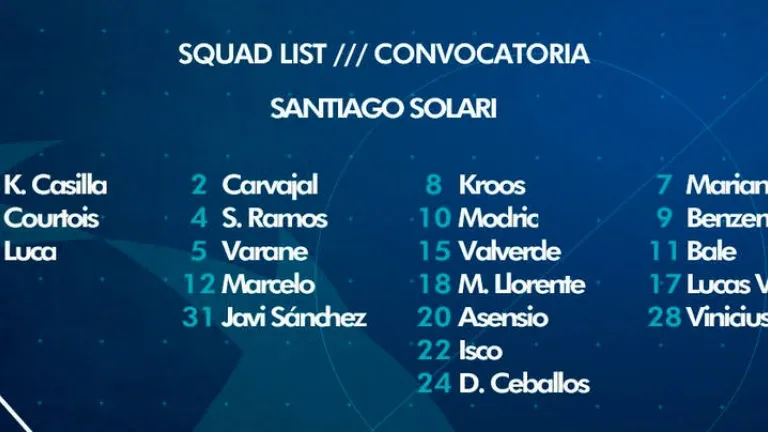 La lista de convocados la integran: Courtois, Kiko Casilla, Luca Zidane, Dani Carvajal, Varane, Sergio Ramos, Javi Sánchez, Marcelo, Casemiro, Marcos Llorente, Fede Valverde, Kroos, Modric, Ceballos, Isco, Marco Asensio, Lucas Vázquez, Vinicius, Bale, Benzema y Mariano.