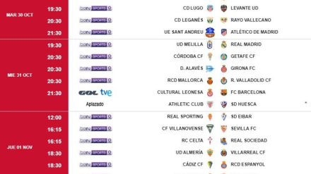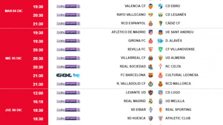 Encuentros: Ebro-Valencia (19:30h); Lugo-Levante (19:30h); Leganés-Rayo (20:30h) y Sant Andreu - Atlético (21:30h).