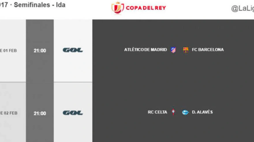 La ida del Atlético-Barcelona se jugará el miércoles 1 de febrero a las 21:00 y la vuelta el martes 7 a las 21:00. El Celta-Alavés será el jueves 2 a las 21:00 y la vuelta en Vitoria el miércoles 8 también a las 21:00.