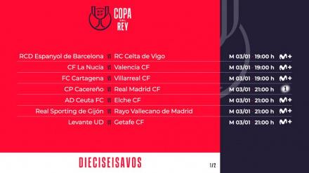 Las 16 eliminatorias se disputarán a partido único los días 3, 4 y 5 de enero. El Real Madrid visitará Cáceres el día 3 a las 21:00 y el Barça viajará a Alicante el 4 a las 21:00.