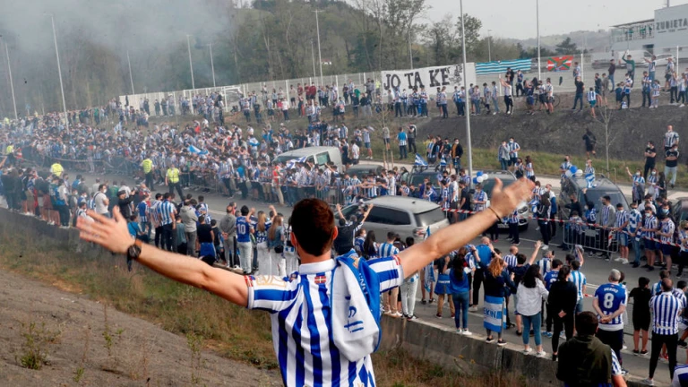 Cientos de aficionados se citan para despedir al autobús de la Real Sociedad antes de partir hacia Sevilla