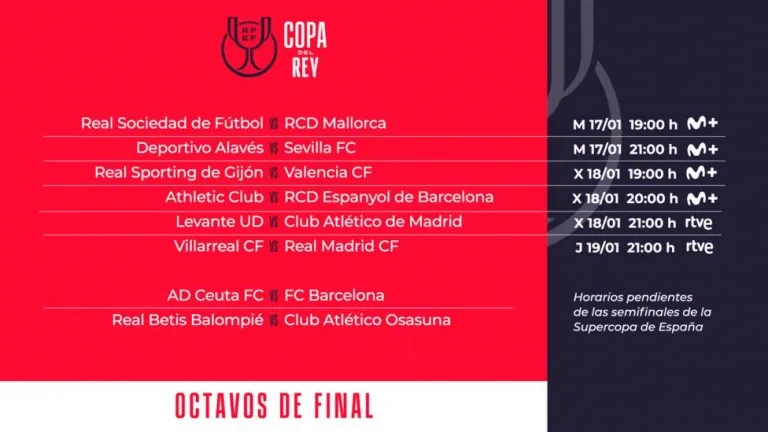 Horarios definidos de los octavos de final de la Copa del Rey: