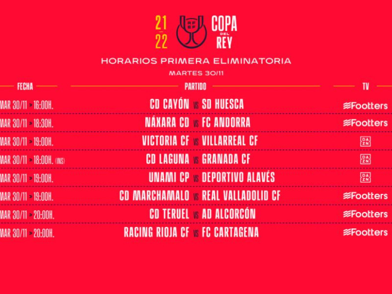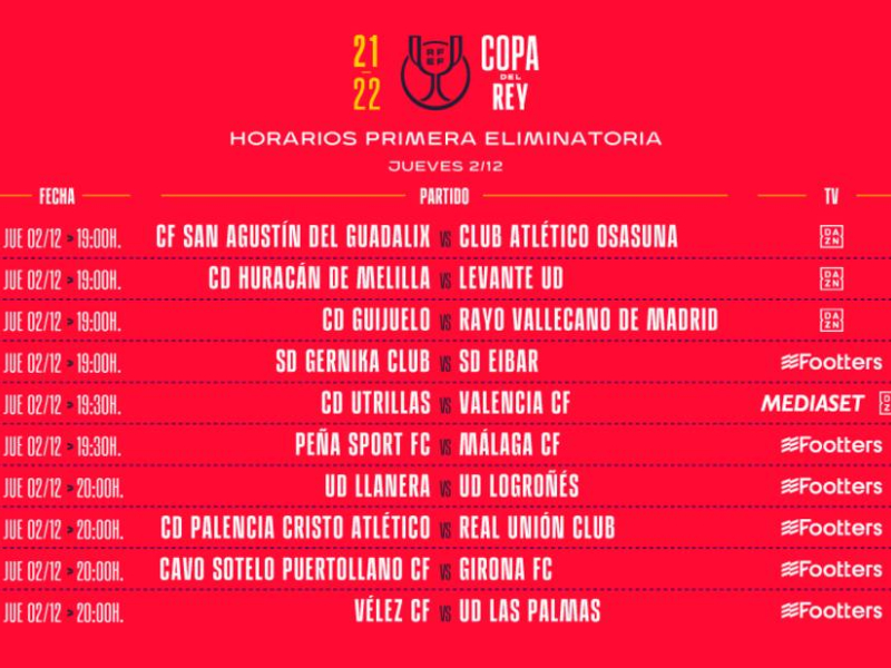 La primera eliminatoria de la Copa del Rey ya conoce sus horarios. Durante los días 30 de noviembre y 1 y 2 de diciembre, los 112 equipos que van a jugar el torneo disputaran esta primera ronda, a la que más adelante se sumarán los conjuntos que van a jugar la Supercopa de España en el mes de enero (Real Madrid, FC Barcelona, Atlético de Madrid y Athletic Club).