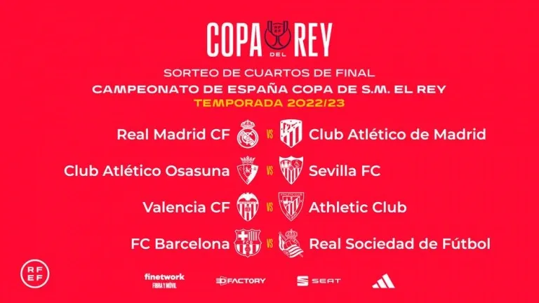 Real Madrid-Atlético; Valencia-Athletic; Osasuna-Sevilla; y Barcelona-Real Sociedad, partidos de cuartos de la Copa del Rey. Se jugarán los días 25 y 26 de enero.