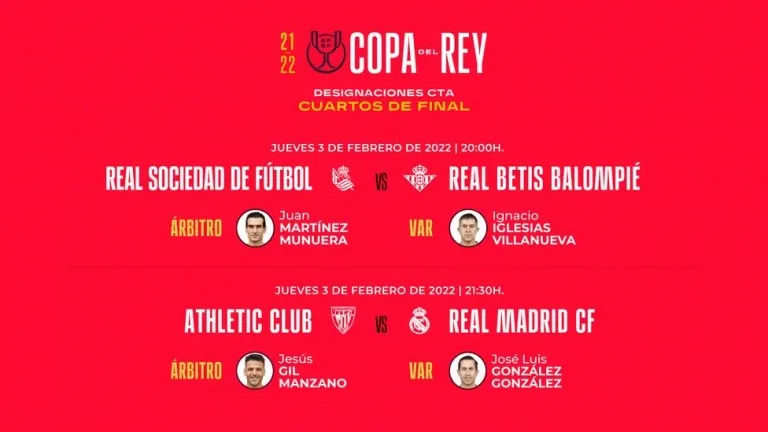 El extremeño Jesús Gil Manzano será el árbitro de los cuartos de final de Copa del Rey entre el Athletic Club y el Real Madrid de este jueves (21.30), mientras que el alicantino Juan Martínez Munuera pitará el partido de la misma ronda del torneo del KO entre Real Sociedad y Betis, según informó la Real Federación Española de Fútbol (RFEF) este martes.