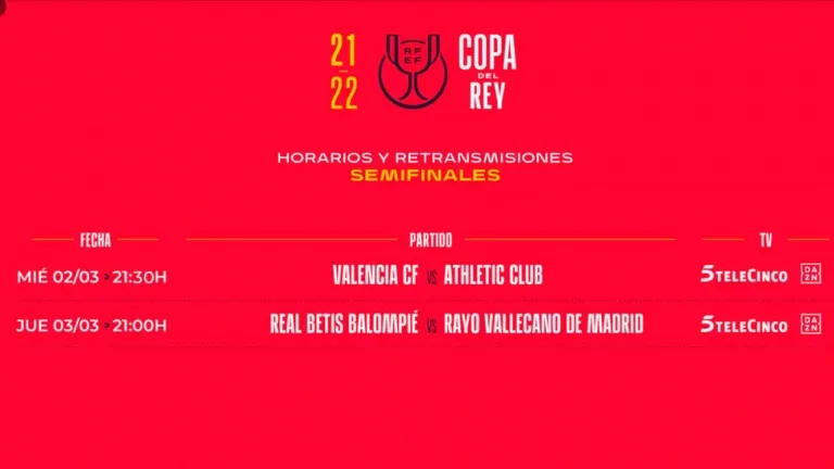 Horarios de vuelta de semifinales de la Copa del Rey, tras la modificación de la hora del Valencia - Athletic