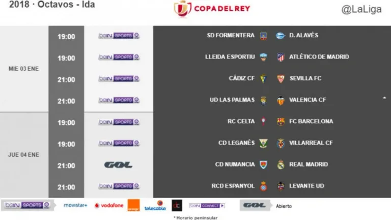 LaLiga ha publicado los horarios de los partido de ida de los octavos de final de la Copa del Rey. Los duelos, los primeros del año 2018, se repartirán entre el miércoles 3 y el jueves 4 de enero con cuatro encuentros cada día.