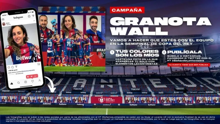 En una campaña pionera en el fútbol español, según han señalado las mismas fuentes, el Levante pide a sus seguidores que publiquen sus fotografías con emblemas levantinistas en Facebook, Twitter o Instagram para que luego se reproduzcan en la pantalla durante el partido.