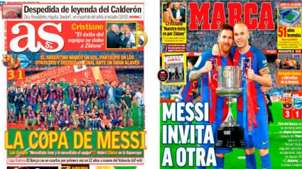 'Marca' apuesta por: "Messi invita a otra Copa" sobre una foto del astro argentino en la que sujeta el trofeo junto a Andrés Iniesta. "Tiró del Barça en la victoria ante un digno Alavés". "Golazo de Theo para el 1-1". "Tercer título seguido para los azulgranas, que ya llevan 29", son los sumarios en su escaparate informativo. "Una Copa más para el rey Messi" es el titular de la crónica principal, que abre una información que abarca hasta la página diecisiete.