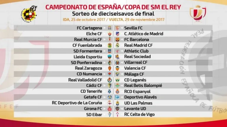 Murcia, Fuenlabrada y Elche se llevaron el gordo en el sorteo de dieciseisavos de final de la Copa del Rey que se ha celebrado este jueves al emparejarse con Barcelona, Real Madrid y Atlético respectivamente. Los partidos de ida se disputarán en el estadio del encuentro de inferior categoría entre el 24 y el 26 de octubre y los de vuelta entre el 28 y 30 de noviembre.